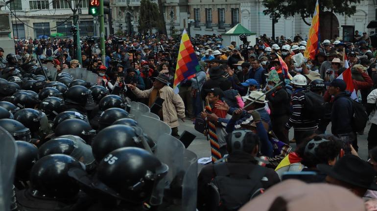 En La Paz, los seguidores de Morales, que marcharon hasta la ciudad sede del Gobierno, intentaron ingresar a la Plaza Murillo, agrediendo a personas en la fila del Banco Unión y un periodista de F10.