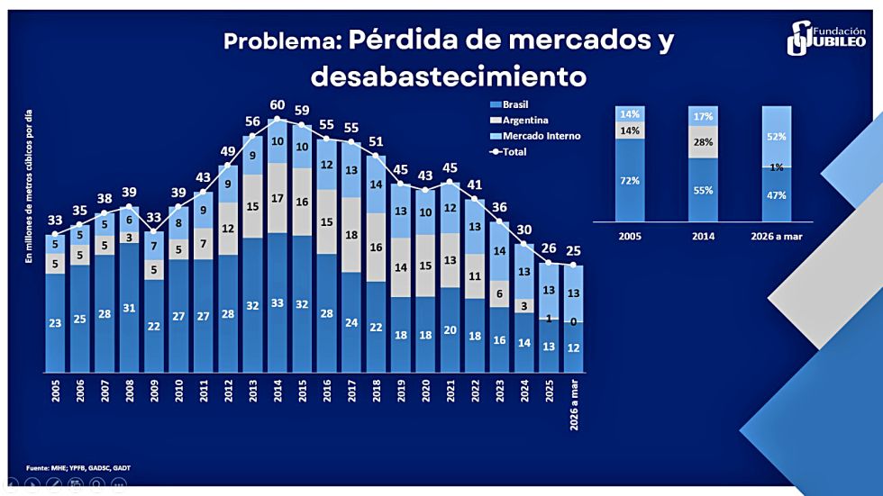 Situación actual. Se observan distorsiones, especialmente en el campo Margarita-Huacaya (Chuquisaca), donde el 65% se destina al mercado interno (precio bajo) y el 35% a exportación (precio alto).