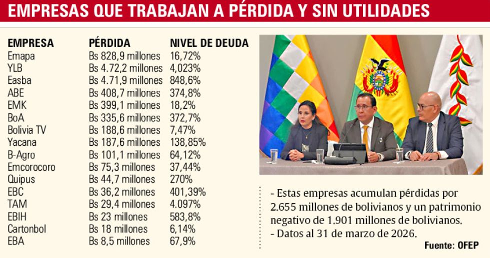 De las 67 empresas públicas que hay en Bolivia, 15 se encuentran en quiebra técnica, acumulando una pérdida de Bs 2.655 millones y un patrimonio negativo de Bs 1.901 millones, según reveló este miércoles la Oficina Técnica para el Fortalecimiento de la Empresa Pública (OFEP) en una conferencia de prensa en La Paz.