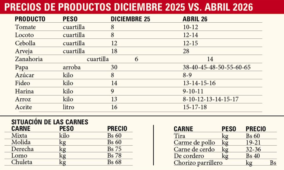 La papa también sufrió un incremento de precio, pues en diciembre se ofrecía la arroba a partir de los Bs 30, pero ahora está por encima de Bs 38.